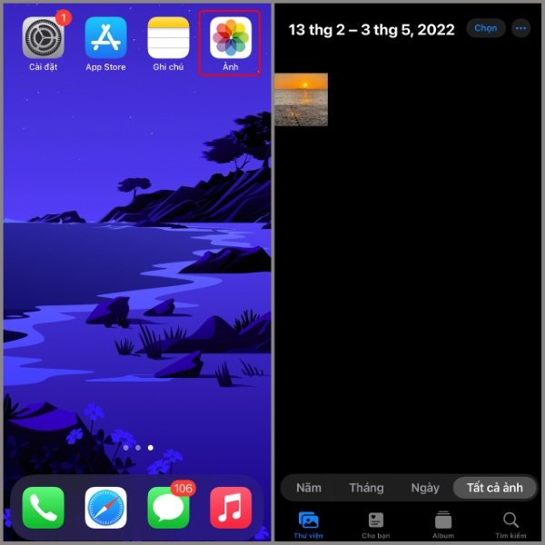 Bước 1: Bạn mở vào ứng dụng Ảnh trên điện thoại iPhone > chọn tiếp vào hỉnh ảnh muốn thêm hoặc thay đổi vị trí.
