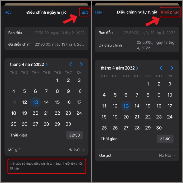 Bước 5: Sau khi, bạn chỉnh sửa ngày giờ xong thì hình ảnh sẽ hiển thị lại với thời gian thay đổi ở bên dưới. Bạn nhấn Sửa để hoàn tất việc thay đổi. Nếu bạn muốn đưa mốc thời gian quay lại về ban đầu thì bạn chỉ cần nhấn vào Khôi phục là được.