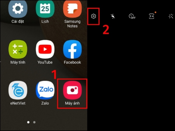 Bước 1: Trước tiên bạn mở ứng dụng máy ảnh trên điện thoại Android của bạn lên. Tiếp theo bạn tìm kiếm và nhấn chạm vào biểu tượng cài đặt tại góc trên cùng bên phải màn hình điện thoại.