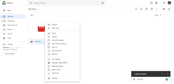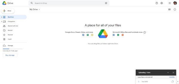 Bước 3: Khi tiến hành tải lên dữ liệu trên Google Drive, bạn sẽ trực tiếp được quan sát tiến trình này thông qua một bảng thông báo nhỏ ở vị trí góc dưới bên phải. Bảng này sẽ cho bạn biết số lượng dữ liệu mà bạn đang thực hiện tải lên là bao nhiêu, thời gian tải cần thiết còn lại bao lâu.