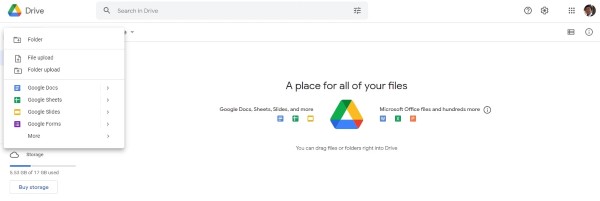 Bước 2: Để bắt đầu quá trình tải lên dữ liệu, bạn có thể tùy chọn vào nút New ở vị trí bên trái để mở ra một bảng chứa các tùy chọn nhỏ liên quan bao gồm:
