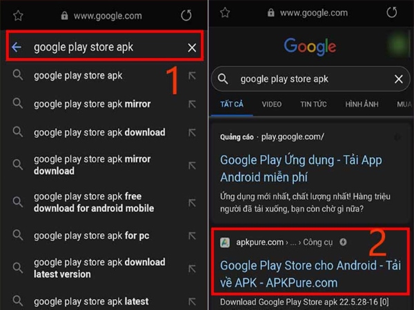 Bước 1: Trước tiên, người dùng truy cập vào trình duyệt Internet trên điện thoại Samsung và nhập từ khóa tìm kiếm “Google Play Store apk”. Tiếp theo bạn đi đến liên kết của trang apkpure.com.
