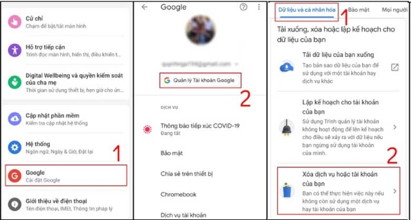 Ngoài cách trên, người dùng hãy thử xóa tài khoản Google trên thiết bị Samsung của mình rồi tiến hành đăng nhập lại. Cách thực hiện xóa tài khoản Google như sau: Mở Cài đặt >> chọn mục Tài khoản >> chọn Thêm tài khoản >> chọn vào Google >> chọn Quản lý Tài khoản Google >> chọn dữ liệu và cá nhân hóa >> chọn Xóa dịch vụ hoặc tài khoản của bạn.