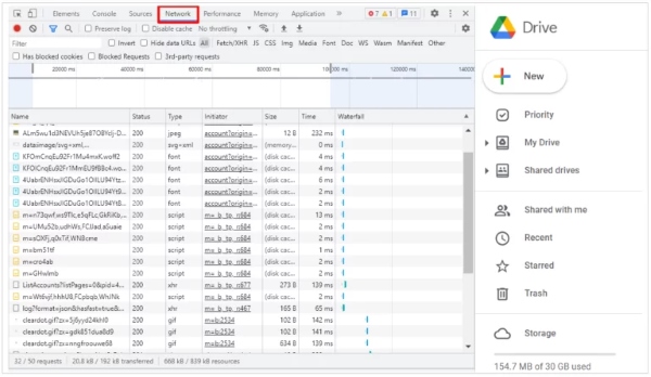 Bước 1: Mở file cần tải trên Google Drive > nhấn phím F12 trên bàn phím máy tính > chọn mục Network > nhấn tiếp phím F5.