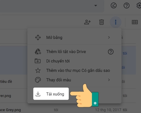 Bước 1: Bạn mở ứng dụng Google Drive lên > sau đó nhấn vào biểu tượng các hình ô vuông nhỏ để nó xuất hiện như hình bên dưới. Nếu muốn tải file nào về thì hãy chạm vào biểu tượng 3 dấu chấm nằm ở phía bên phải của tên file cần tải về.