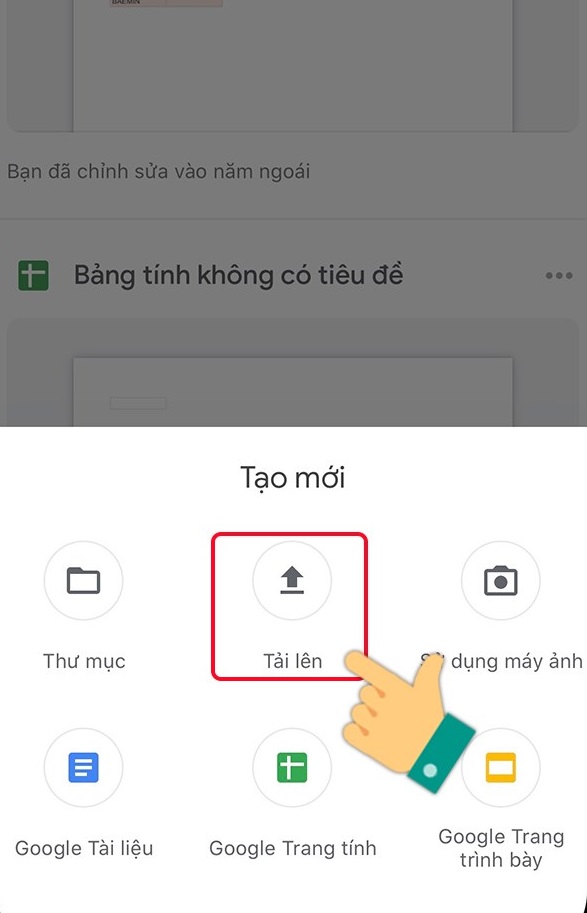 Đầu tiên, bạn hãy tải về và cài đặt ứng dụng Google Drive trên điện thoại. Sau đó, mở ứng dụng lên và nhấn vào biểu tượng dấu + ở góc dưới bên phải màn hình rồi chọn vào mục Tải lên.