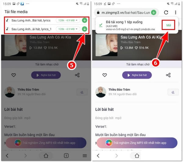 Bước 4: Cuối cùng bạn chọn chất lượng tải nhạc Zing MP3 muốn tải về và nhấn vào biểu tượng tải. Đợi hoàn tất tải về bạn có thể nhấn Mở để nghe nhạc.