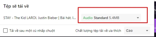 Bước 6: Trên thanh thông báo hiện Tệp sẽ tải về với đầy đủ thông tin: Tên bài hát, chất lượng âm thanh,… Bạn cũng có thể tích chọn vào ô Tải về sau một cú nhấp chuột để rút ngắn thao tác trong những lần tải về tiếp theo.