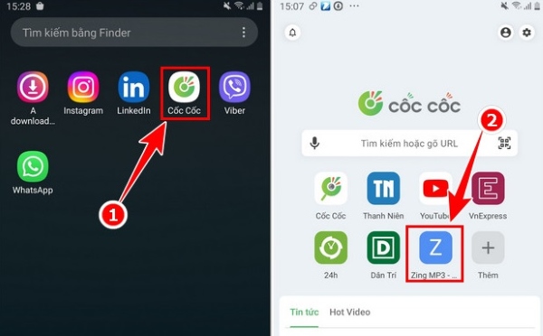 Mở trình duyệt Cốc cốc trên điện thoại và truy cập vào trang web Zing MP3