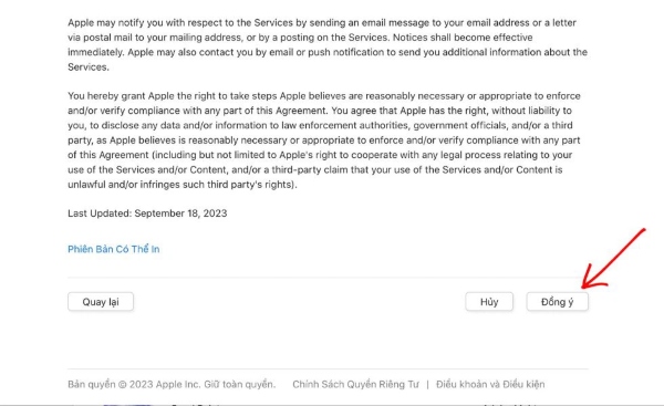 Bước 4: Tại cửa sổ hiện ra các điều khoản, bạn kéo xuống dưới và nhấn Đồng ý.