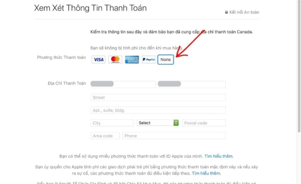 Bước 5:Tại mục thông tin thanh toán, bạn chọn vào mục None và không cần ghi đầy đủ các thông tin tiếp theo.