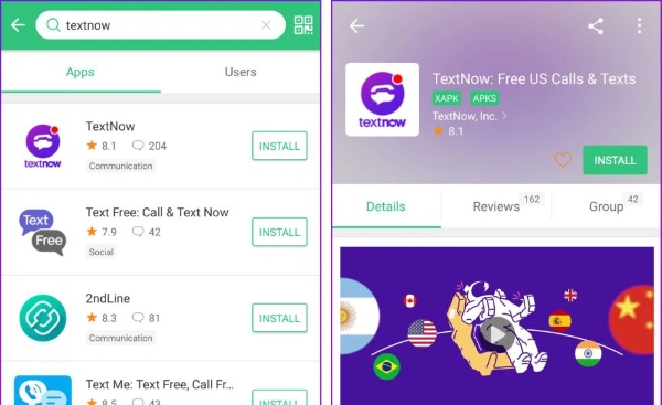 Bước 3: Sau đó, bạn mở vào ứng dụng APK để tìm kiếm TextNow > nhấn Install để tải ứng dụng về máy và bắt đầu sử dụng.