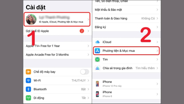Bước 1: Mở vào Cài đặt trên điện thoại iPhone > chọn tài khoản ID Apple > chọn tiếp mục Phương tiện & mục mua.