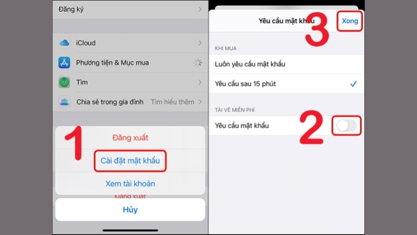Bước 2: Nhấn chọn vào Cài đặt mật khẩu > gạt thanh màu xanh để tắt mục Yêu cầu mật khẩu > nhấn Xong.