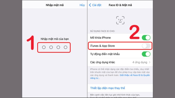 Bước 4: Nhập mật khẩu điện thoại iPhone > vào mục Sử dụng Face ID > tiến hành tắt iTunes & App Store.