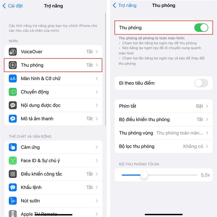 Sau đó, bạn nhấn chọn vào mục Thu phóng, rồi kích hoạt tính năng Thu phóng bằng cách gạt nút sang phải là được.