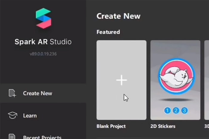 Bạn tiếp tục mở ứng dụng Spark AR Studio trên máy tính, chọn Create New rồi bấm vào mục Blank project.