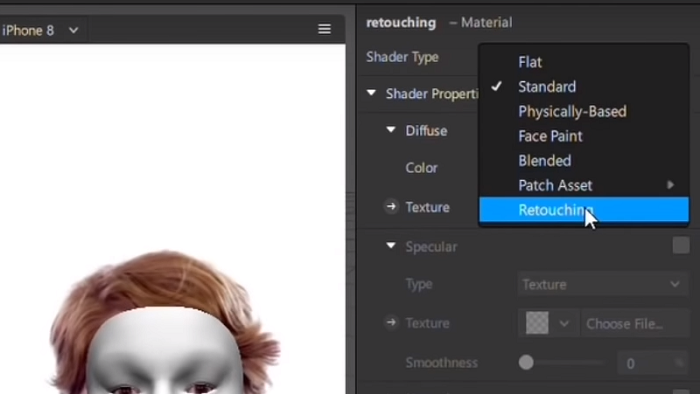 Ở tab retouch bên phải, tại Shader Type, bạn hãy chọn Retouching.