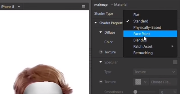 Tại tab makeup bên phải, bạn chọn Face Paint trong mục Shader Type.