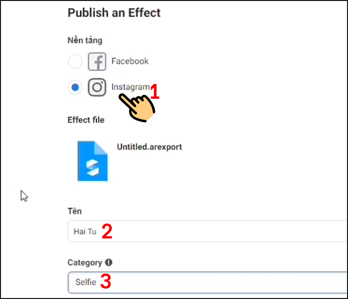 Sau đó chọn mục Instagram rồi đặt tên filter và chọn mục Catogory là Selfie.