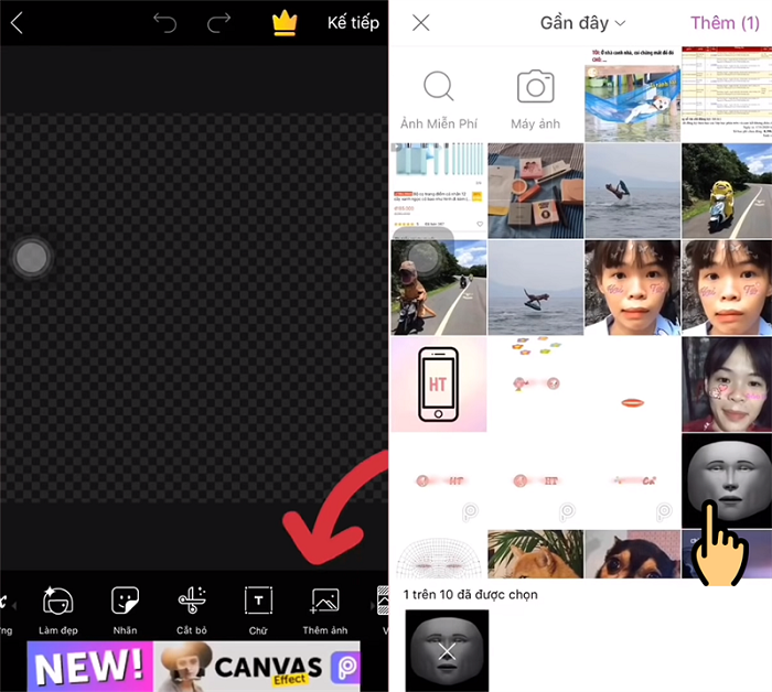 Ở bước này, bạn chọn mục Thêm ảnh, rồi bấm vào ảnh khuôn mặt bạn vừa tải về máy để giả lập khuôn mặt.