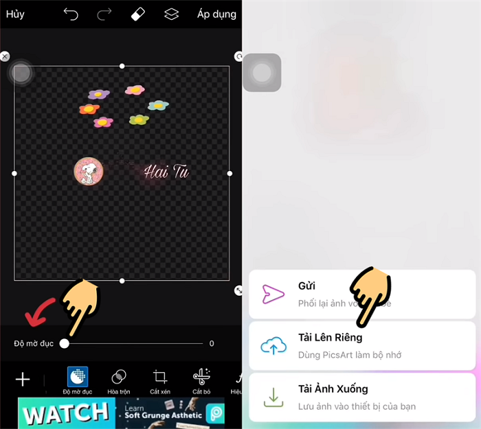 Sau khi điều chỉnh vị trí các sticker cho phù hợp với khuôn mặt, bạn hãy kéo độ mờ đục về 0, rồi nhấn Áp dụng và chọn mục Tải lên.