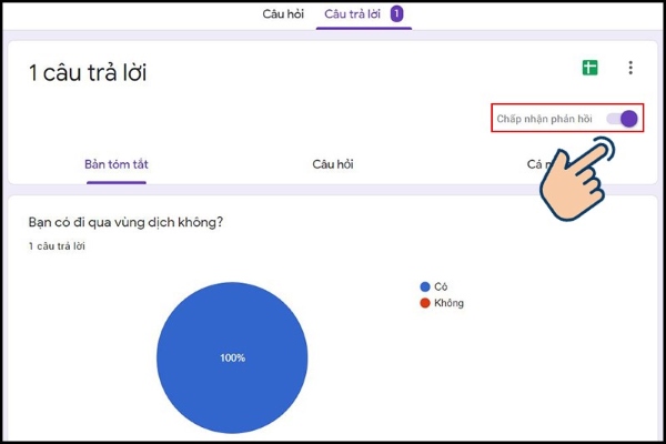 Bước 2: Nếu muốn ngừng nhận câu trả lời, chọn và gạt thanh ngang “Chấp nhận phản hồi”. Khi đó, sẽ không ai có thể nhập câu trả lời vào form nữa.