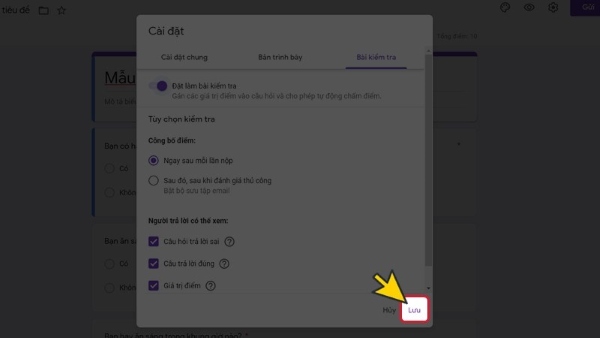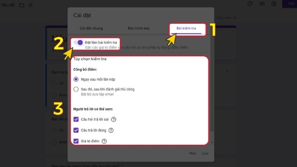 Bước 2: Trong bảng cài đặt, chọn tab “Bài kiểm tra” và bật chế độ “Đặt làm bài kiểm tra”. Sau đó, thiết lập các Tùy chọn kiểm tra như sau: