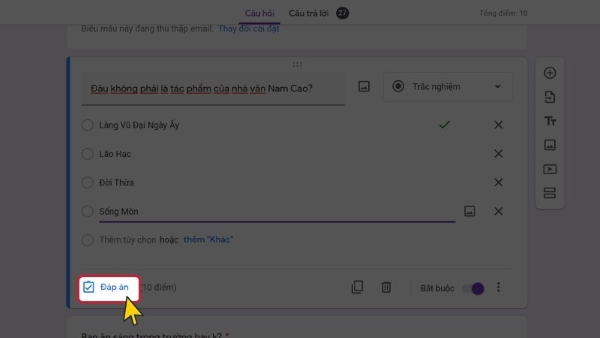 Để chấm điểm câu trả lời trong Google Form, làm theo các bước sau: