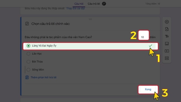 Bước 5: Chọn một (hoặc nhiều) đáp án đúng > Nhập điểm số > Nhấn “Xong”.