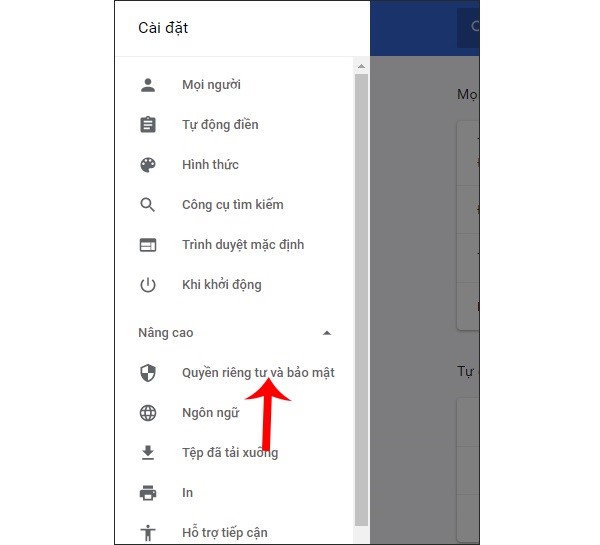 Bước 2: Trong giao diện mới, nhấp vào mục Nâng cao, sau đó kéo xuống và chọn Quyền riêng tư và bảo mật.