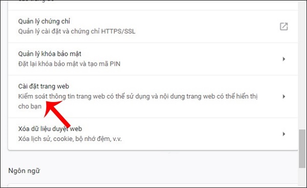Ở phía bên phải, chọn Cài đặt trang web để quản lý nội dung hiển thị trên các trang web.