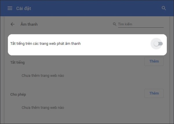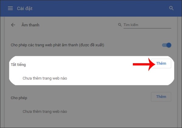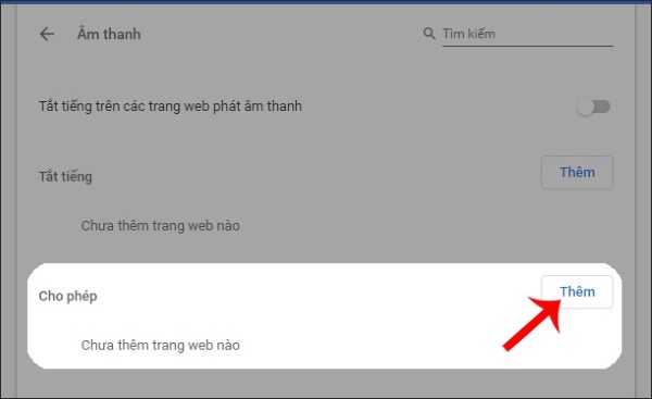 Tương tự, nếu đã tắt âm thanh toàn bộ nhưng muốn bật tiếng cho một số trang đặc biệt, hãy chọn Thêm trong mục Cho phép, nhập URL của trang cần kích hoạt âm thanh để tạo ngoại lệ.