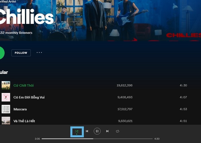 Bước 2: Rê chuột đến menu bạn sẽ thấy có tùy chọn “Shuffle”. Đây là tùy chọn để tắt chế độ phát ngẫu nhiên. Bạn nhất vào biểu tượng 2 mũi tên đan vào nhau đến khi chuyển sang màu trắng là hoàn thành.