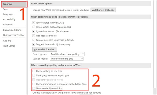 Bước 2: Trong mục Proofing, tìm đến phần When correcting spelling and grammar in Word và loại bỏ dấu chọn tại: