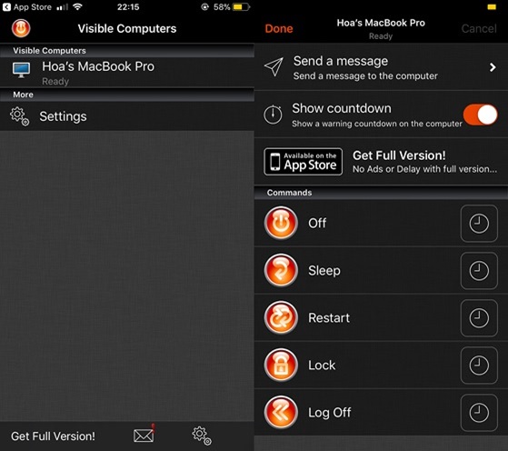 Hãy mở ứng dụng Off Remote trên iPhone, chạm vào tên máy tính cần tắt từ xa. Lúc đó sẽ xuất hiện các tùy chọn như Off (tắt máy), Sleep (ngủ), Restart (khởi động lại), Lock (khóa máy) và Log Off (đăng xuất). Khi thực thi một lệnh bất kỳ, trên màn hình sẽ xuất hiện thông báo và bắt đầu đếm lùi 10 giây. Nếu muốn sử dụng các tính năng nâng cao bạn cần phải trả phí.
