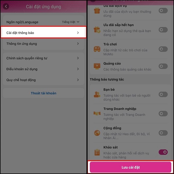 Bước 2: Trong phần Cài đặt ứng dụng, bạn chọn vào phần Cài đặt thông báo >> tắt các thông báo mà bạn không muốn nhận trên MoMo >> Chọn Lưu cài đặt để hoàn thành việc tắt thông báo quảng cáo MoMo tránh trường hợp bị làm phiền quá nhiều nha.
