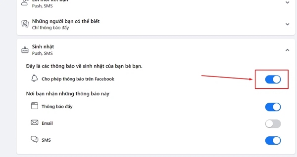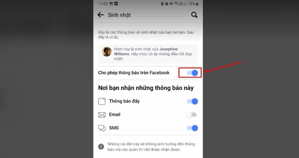 Bước 6: Tại phần “Sinh nhật”, bạn chọn vào tùy chọn cho phép tắt thông báo sinh nhật và chọn “Tắt”.