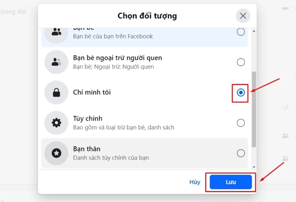 Bước 6: Tại một cửa sổ mới hiện ra trên màn hình, bạn sẽ thấy các tùy chọn khác nhau. Hãy chọn “Chỉ mình tôi”, sao đó kéo xuống phía dưới cùng và nhấn vào nút “Lưu” để lưu lại những thay đổi của bạn.