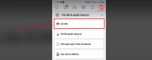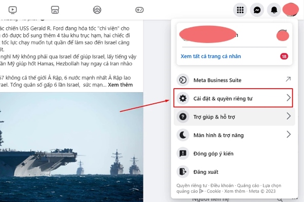 Bước 3: Nhấn tiếp vào biểu tượng dạng hình tam giác đảo ngược tại góc trên bên phải màn hình > chọn “Cài đặt và quyền riêng tư”.