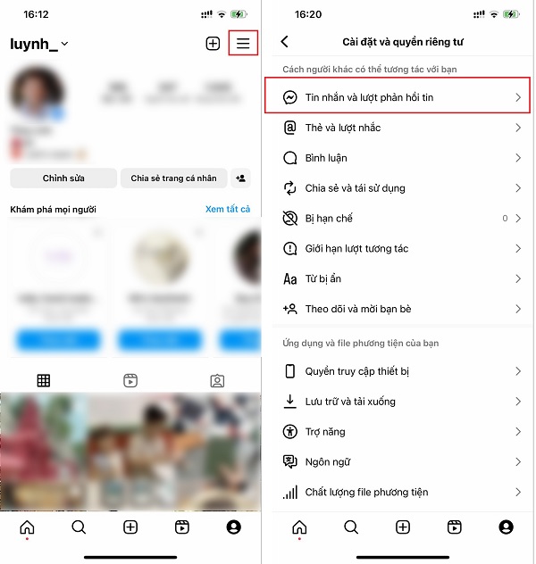 Đầu tiên, bạn truy cập vào Instagram và bấm vào biểu tượng tài khoản ở góc dưới bên phải màn hình. Sau đó, bấm tiếp vào biểu tượng 3 dấu gạch ở góc trên bên phải, rồi tiếp tục chọn mục Tin nhắn và lượt phản hồi tin.