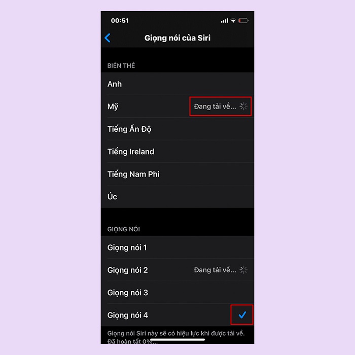 Bước 3: Lúc này màn hình sẽ hiển thị tên khu vực các nước và giọng nói nam/ nữ của hệ thống. Tiếp đến, bạn nhấn vào từng lựa chọn để nghe thử giọng mới của Siri. Khi đã chọn được giọng mới, hệ thống sẽ cần một chút thời gian để xử lý dữ liệu nên bạn cần chờ đến khi xuất hiện dấu tích xanh để cài đặt hoàn thành.