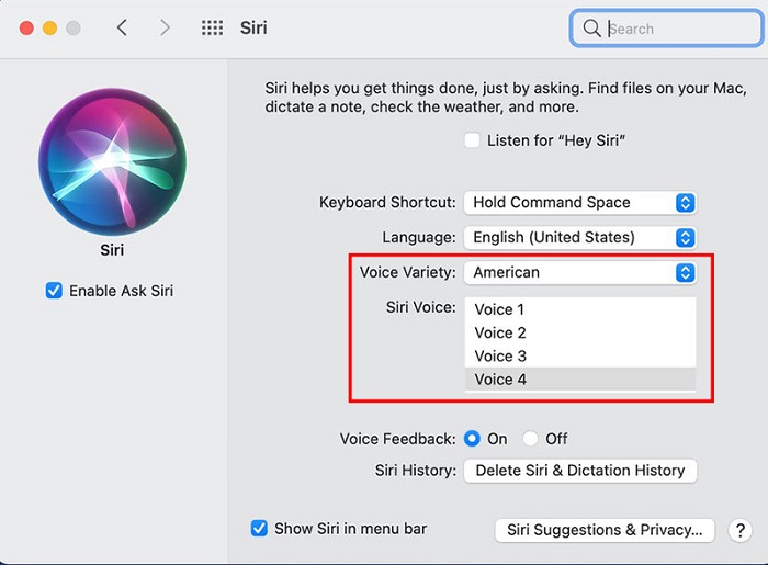Ngoài cách thay đổi giọng nói cho Siri trên iPhone, chúng ta còn có thể cài đặt trên Macbook. Nếu trên Macbook bạn cần cập nhật lên macOS 11.3. Sau đó vào Cài đặt/ Chọn Siri, sau đó bạn vào mục Voice Variety rồi chọn Voice 1,2,3,.. để thay đổi giọng nói tùy vào những lựa chọn mà Apple đưa ra.