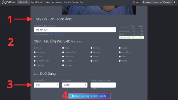 Bước 4: Chọn kích thước hình ảnh muốn chỉnh. Ví dụ bạn chọn nhỏ hơn ảnh gốc 50%, không hiệu ứng và chọn loại file muốn lưu về máy (JPG, PNG, JPEG,…) > chọn XONG, THAY ĐỔI KÍCH THƯỚC ẢNH CỦA TÔI!