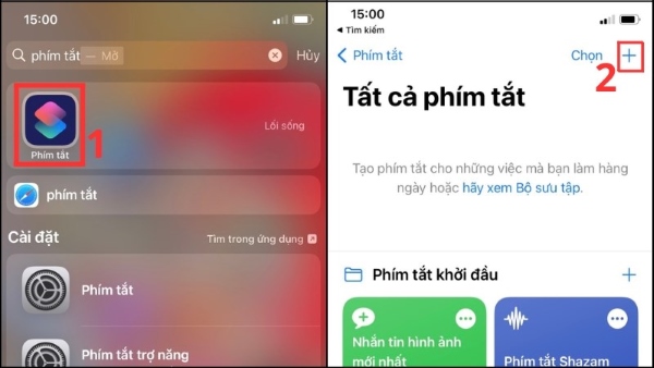 Bước 1: Mở ứng dụng Shortcuts (phím tắt) trên điện thoại lên > Nhấn chọn dấu cộng “+” tại góc trên bên phải màn hình để tiến hành thêm phím tắt mới.