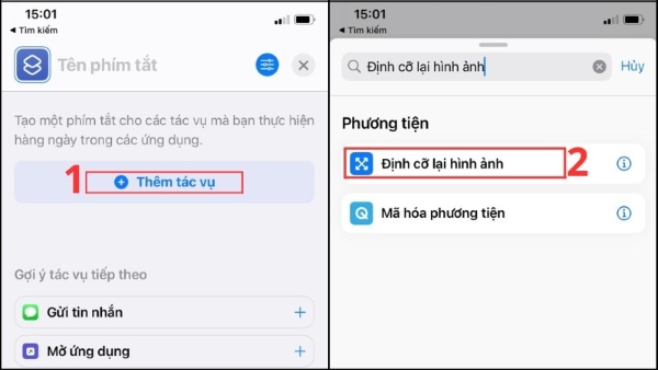 Bước 2: Nhấn chọn Thêm tác vụ > tìm kiếm lệnh Định cỡ lại hình ảnh trên thanh tìm kiếm > nhấn chọn tác vụ này để thêm vào phím tắt.