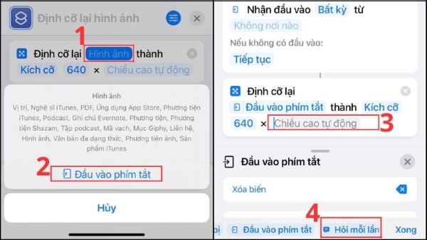 Bước 3: Chọn vào Hình ảnh > chọn Đầu vào phím tắt > chọn Chiều cao tự động > chọn Hỏi mỗi lần để nhập lại kích thước hình ảnh mới mỗi lần bạn sử dụng tính năng này.