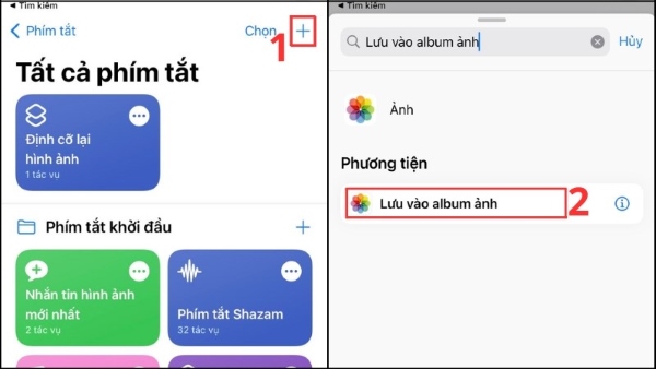 Bước 4: Nhấn dấu cộng “+” bên dưới > chọn lệnh Lưu vào Album ảnh trên thanh tìm kiếm > chọn tác vụ này để thêm vào phím tắt để điện thoại iPhone sẽ mặc định lưu lại hình ảnh đã resize kích thước vào Album Gần đây.