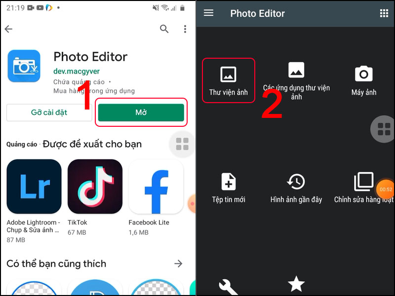 Bước 1: Trước tiên, bạn cần tải ứng dụng Photo Editor về điện thoại Android. Sau đó bạn chọn Mở > chọn vào Thư viện ảnh.