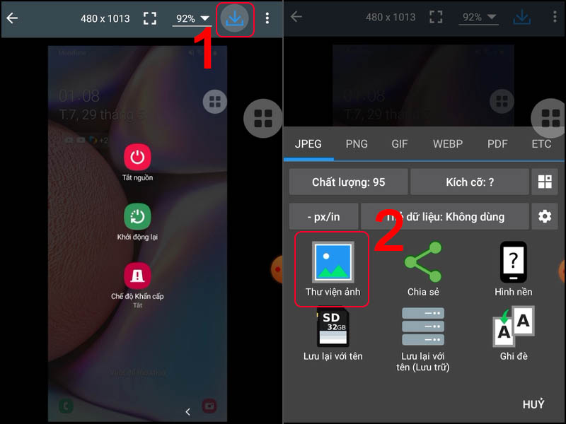 Bước 4: Chọn biểu tượng mũi tên chỉ xuống để lưu hình ảnh > chọn Thư viện ảnh.